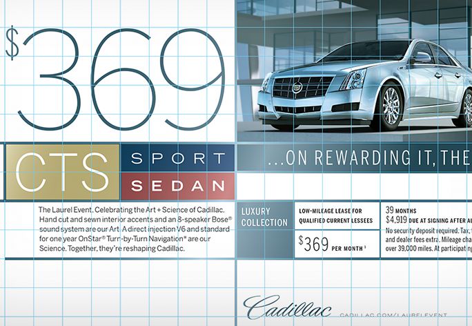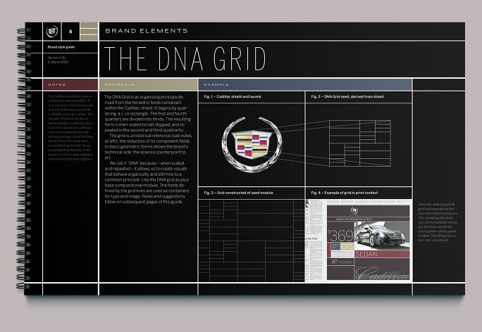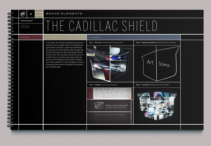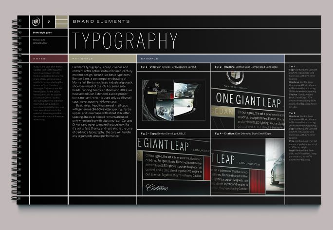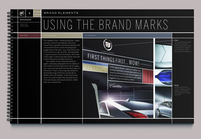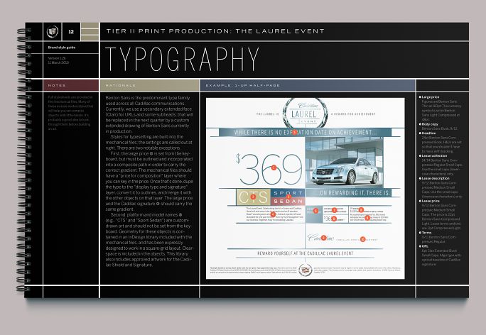 While this document delves a bit into specifics, it is more philosophical treatise than standards manual, showing GM in-house folks and selected partners how the traditional Cadillac brand accoutrements would be deployed and also telling them why. We certainly didn’t expect to be producing every bit of communication for the company; this document allowed us to share the campaign’s underpinnings with those who would, and also gave us a place to codify and keep them for ourselves. On a project of this scale and velocity, you make up a lot of things as you go along; which is fine, as long as you remember what they were and why you did them.