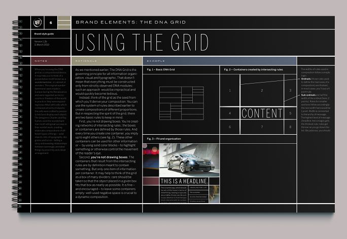Guidelines on abstracting and using the DNA grid. While we wanted every composition to start from the root grid, we knew that insisting that the whole thing must adhere to the root would quickly grow tedious and unworkable. For the most part, it was a guideline; good executions would reference the grid as a cue, without being slavish.