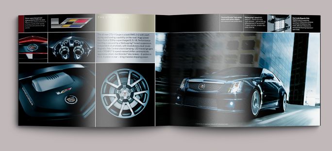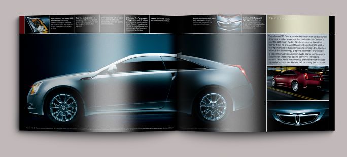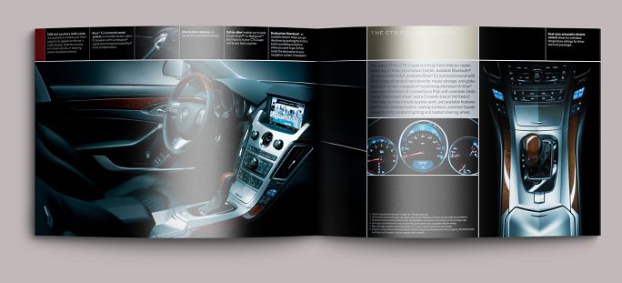 That emphasis carries through the text. Language is limited to callouts distributed along the top of the page and a short informational paragraph printed on a background of metallic silver and gold. The rest is all image. The magnificent profile shot of the CTS Coupe was made by Peter Jennings, the running shot by John Higginson, the details by Shu Akashi.