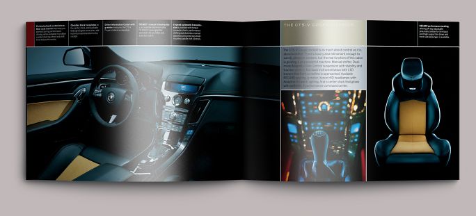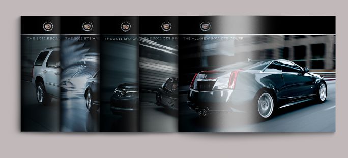 In response to the austerity imposed by GM’s bankruptcy, Johnson+Wolverton structured the overall brand project (discussed above) around the creation of a library of photographic and film assets to be used for the two years of the Art+Science campaign. (Automakers typically change out styles every two years, so the cars we documented would be around that long.) Creating this library up front would do two things: ensure consistent art direction across the campaign and guarantee that the tedium of the approval process would be a memory when the time came for applications like these brochures.