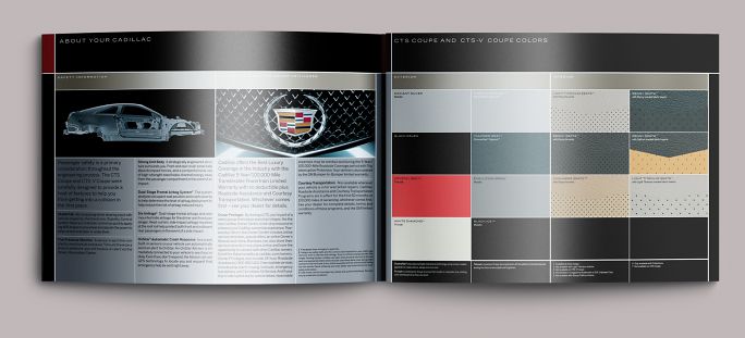 Safety and warranty information faced with color and upholstery choices. Each of the available colors was printed in a custom metallic or flake ink, even the black.