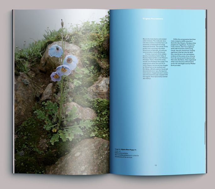In botany, the color blue is harder to find than you might think. Most flowers that we perceive as blue are actually violet, with the exception of Meconopsis baileyi, a blue poppy found only above the tree line in the western Himalayas. The pursuit and representation of this bloom was the wellspring for a course of study and body of work from Brooklyn artist Virginia Poundstone.