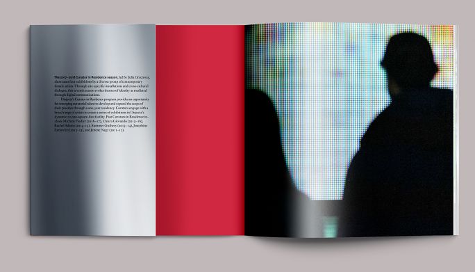 The table of contents, illustrated with a view of Sondra Perry’s exhibit Chromatic Saturation. One of the characteristics of the digital press we used is that it doesn’t print with a traditional process rosette, so printing small text type as a 4c combo was not a problem. This meant we were able to distinguish the four shows using their component colors without the type breaking up.