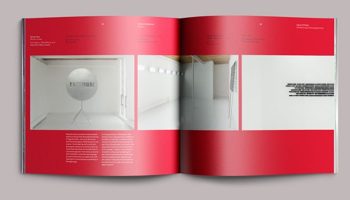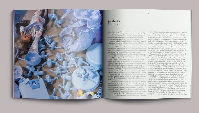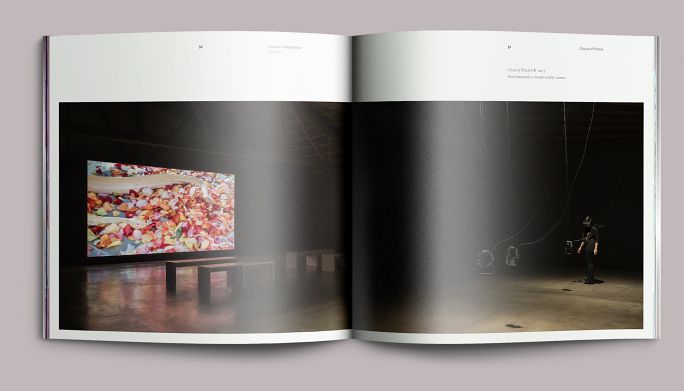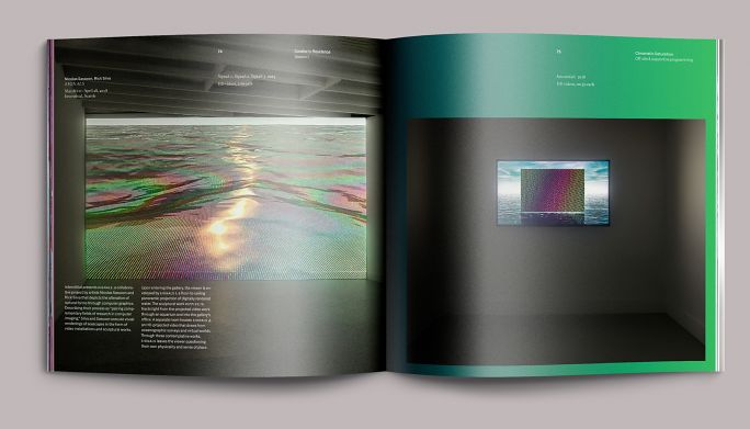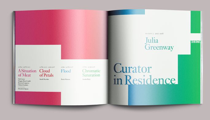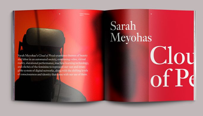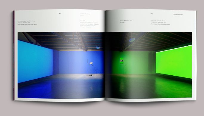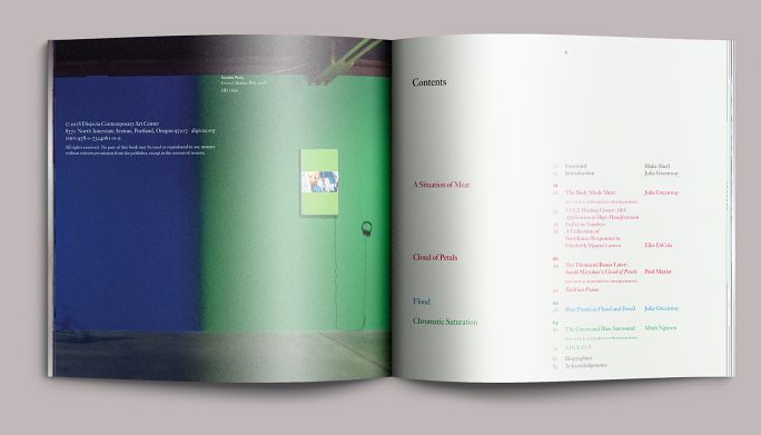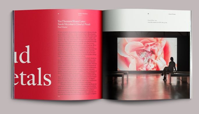 Each exhibition in the season had a color motif: fuchsia for A Situation of Meat, red for Cloud of Petals, blue for Flood, and a blend of chroma-key blue to chroma-key green for Chromatic Saturation. The opening pages of each section reprised these colors as well as the dynamically set type from the exhibition title wall. We paced these sections in the same sequence that they would be encountered on-site, moving the eye from one part of the exhibition to the next as if the book were a window.