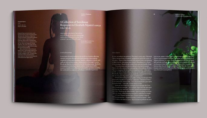 Elizabeth Mputu’s performance sanza required a different treatment. Part of the opening exhibition A Situation of Meat, sanza was both related programming and considered by Greenway to be integral to that exhibition. It receives a synopsis for context (as it couldn’t be shown integrated with that show’s visual work) and an essay. We ran Mario Gallucci’s moody documentary images large and reversed the essay out of them.