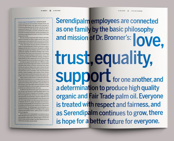 The inaugural All-One Report was a fifty-six-page tabloid, printed in color on recycled newsprint by a family-owned web press in Oregon’s Willamette Valley, and wrapped in a two-sided poster. Comprising twenty-five short articles, it told the story of the company’s history and current activities not through an omniscient narrator, but in the voices of its own employees from around the world, punctuated by well-chosen excerpts from Dr. Bronner’s exegesis The Moral ABC.