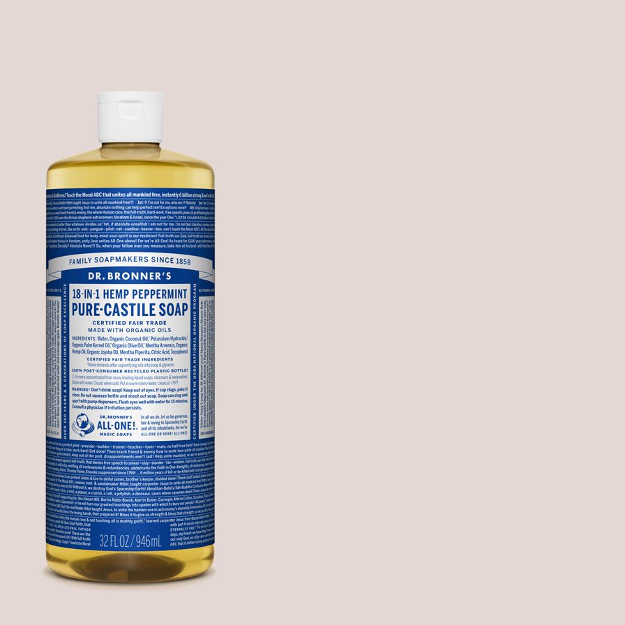 The original Dr. Bronner’s label was black and gold; Dr. Bronner changed the colors of his liquid soap label to blue and white—the colors of the Israeli national flag—shortly after Israel declared statehood in 1948. Blue has been the color of Dr. Bronner’s peppermint soap (and the Dr. Bronner’s company) ever since.