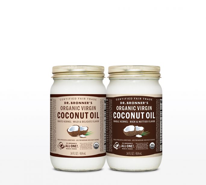 Dr. Bronner’s grows much of its own fair trade and organic coconut crop in a joint venture with local Sri Lankan farmers called Serendipol. Much of the resulting oil is used in its soaps, but the quality is so high that some is reserved for sale as food. This package uses several visual cues to tie it back to the general Dr. Bronner’s product language: there is no “Family Soapmakers” banner, but the “Certified Fair Trade” feature is curved to refer to it. The curve is repeated at the bottom in a nod to traditional food packaging and also to provide enough clearspace for the USDA weights and measures declaration standard.