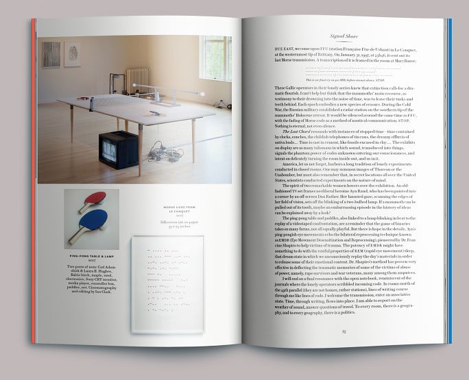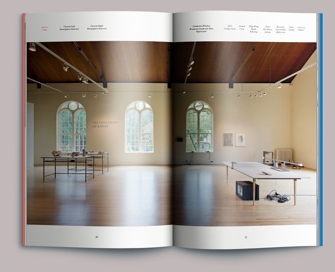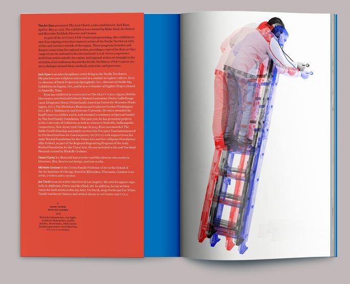 The Art Gym was configured as one large room for this exhibition. The catalog is constructed around a series of installation photographs by Evan La Londe that begin by facing east from the entrance and panning clockwise. After each installation image, we moved in to show the work framed within it in detail. Caption information runs along the top edge of the page, in approximately the same position as the labeled works.