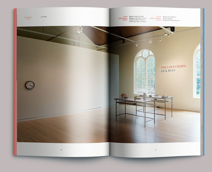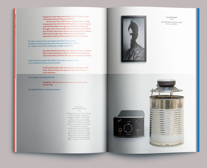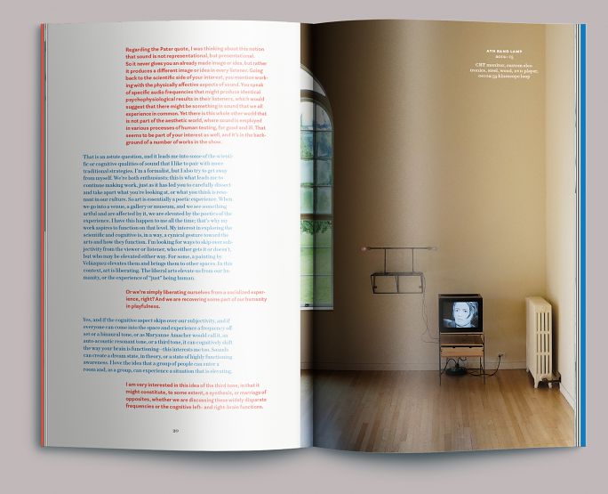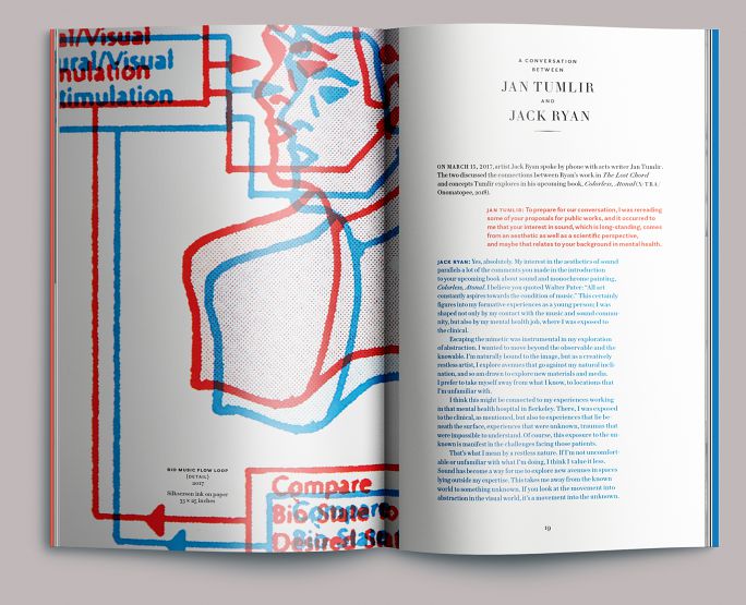 At left is a detail of Ryan’s Bio Music Flow Loop (2017). We set the artist’s conversation with critic Jan Tumlir in red and blue, both as a nod to Ryan’s work and to establish a distinct visual voice for each speaker.