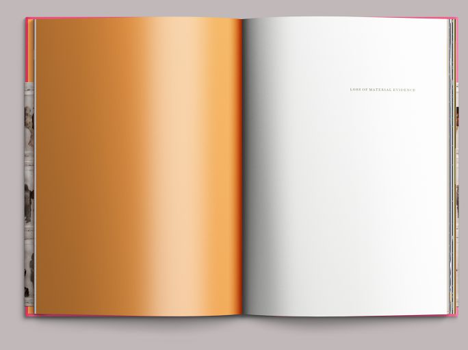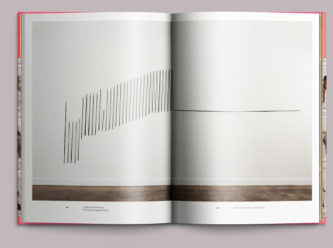 The pacing of Loss of Material Evidence is based on a visitor’s movement through the galleries. Installation images like this one, used two or three in sequence, create the book’s four divisions, panning the room before moving in on the work that starts the next section.