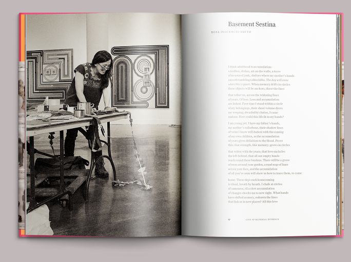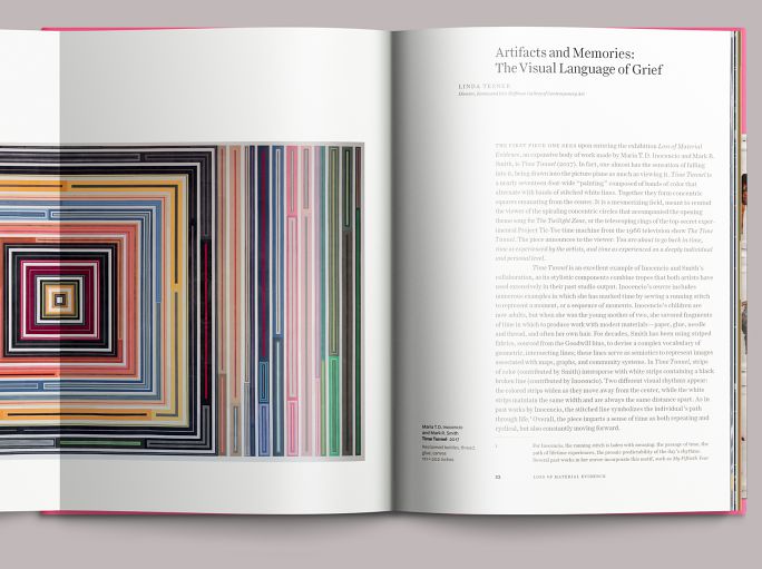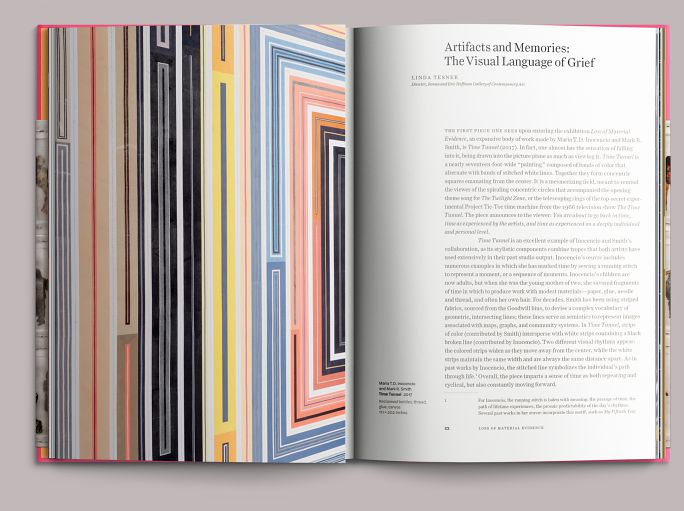 The book is a product of—rather than a companion to—the exhibition. Most of the photography was done shortly before the show opened and is organized to give a sense of movement through the galleries. Though it is freighted with cues to the artists’ work—the pink cloth and striped endbands refer to Smith’s long-standing use of bright thrift-store fabrics in his wall pieces, for example—the overall presentation is quiet and restrained. The book sits comfortably in the hand; large details and wide-format works are accommodated by gatefolds. Curator Linda Tesner’s essay is printed in dark gray with a dull base so that it recedes into the page, and its illustrations track the text closely, eliminating the need to flip back and forth. At book’s end is an extensive illustrated CV, with the artists’ chronologies presented parallel to one another: Smith in magenta, Inocencio in cyan, and their collaborations in a combination of the two inks.