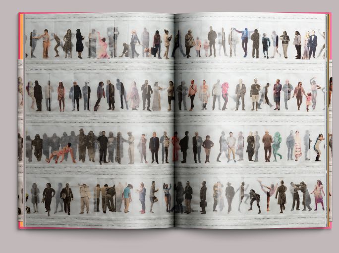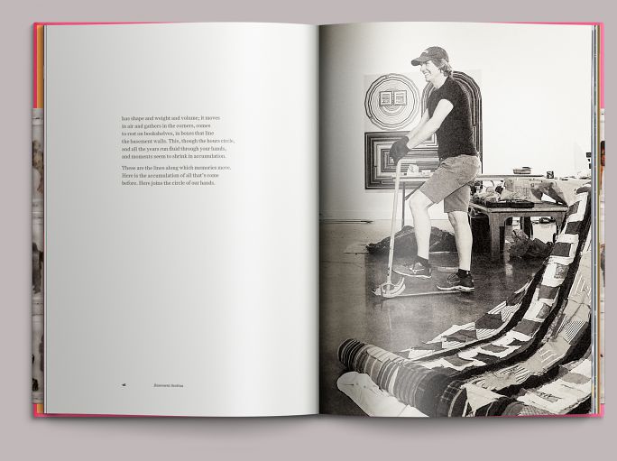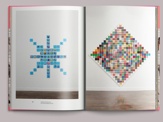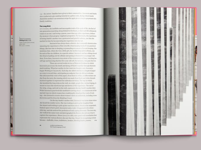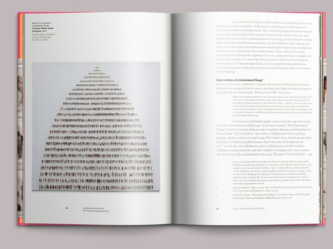 Despite its elegiac subject, much of the exhibition is vivid and colorful. The book is bound in pink cloth: a three-quarter-height dust jacket features a detail of the collaboration I Used to Think I Knew Everyone (2017).
