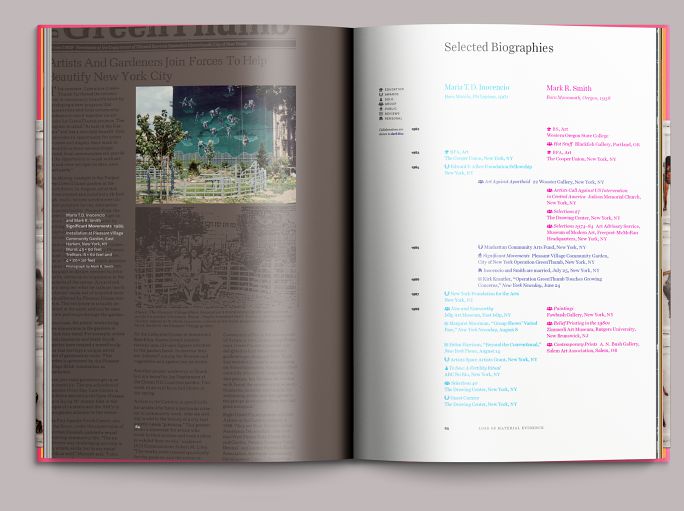 Rather than presenting the artists’ CVs consecutively, we interwove them into a timeline consisting of two concurrent columns, deviating from the traditional section-based format (Education, Solo Exhibitions, etc.) with a system of icons. Inocencio’s chronology is in the left column, printed in process cyan; Smith’s is on the right, printed in process magenta. Collaborations (including children) are shown in a center column using both inks overprinted. Works from periods referenced in the timeline are shown on facing pages.