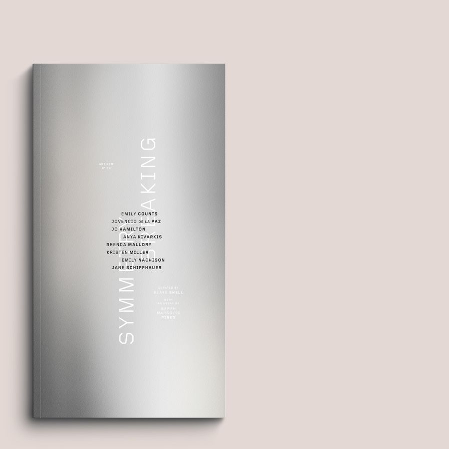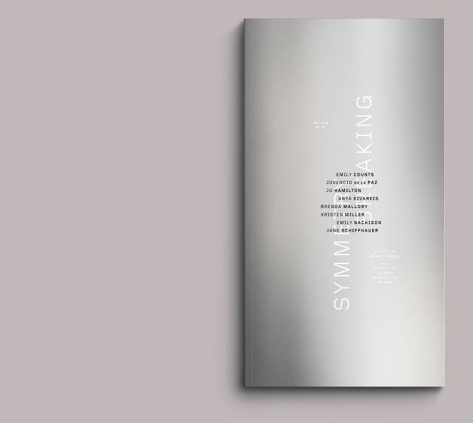 The cover is printed in metallic silver and black on uncoated, vellum-surfaced paper. It is an optical double square—meaning it’s not actually a double square, but a rectangle with its proportions tweaked to feel like one. The typographic scheme contains multiple axes: the title rotates around the horizontal axis; the artist’s names around the vertical, with a corollary: rather than a simple centering, the names align on the first common letter of each, working from top to bottom: e, then j, then a, and so on. This conceit follows through the book. It is symmetrical, but the symmetry is broken. (Please clap.)