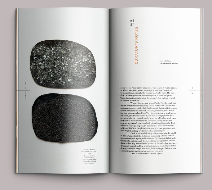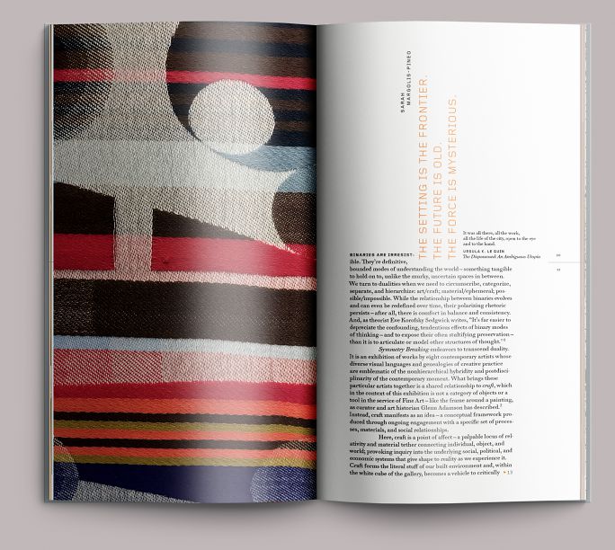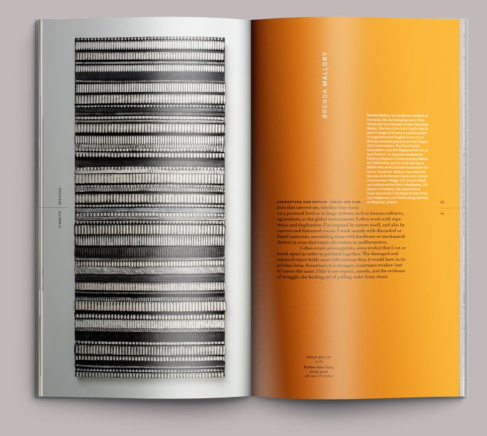 One of the reasons we were able to get away with such a narrow proportion is that the reproductions allowed it. Most of the work in the show was either vertical or squarish in proportion—the wider format pieces could be handled with a crossover. Folios are set to the outside edges of the page, and in some cases will overprint reproductions (see figure 4). As a rule, we won’t do that, but in this case it activated the page in an interesting way, almost as if it were a frame looking down into the artwork.