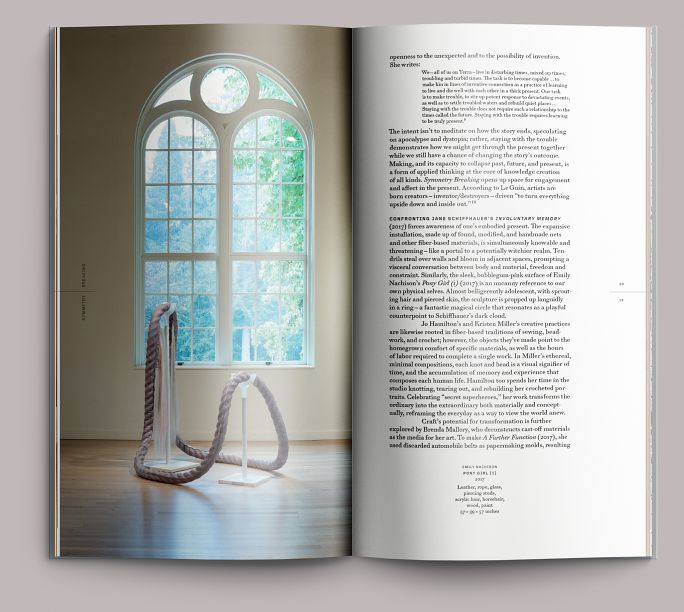 The artists collected in this 2017 exhibition, curated by Blake Shell for the Art Gym, share a common interest in using traditional craft techniques—textiles, jewelry, beadwork, ceramics—in a manner well outside traditional applications. The show’s title is a term borrowed from physics that describes how a system can be changed by apparently insignificant shifts in energy in a way that encourages the development of pattern.