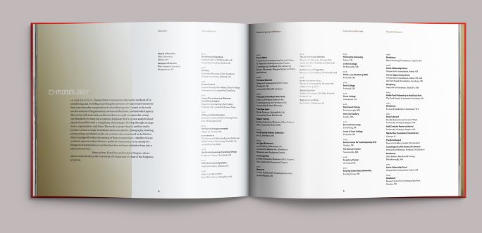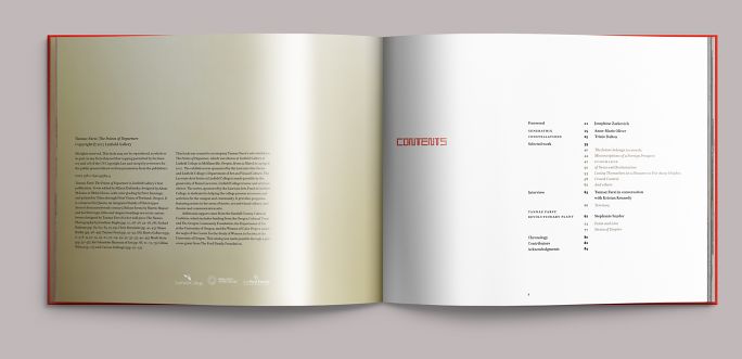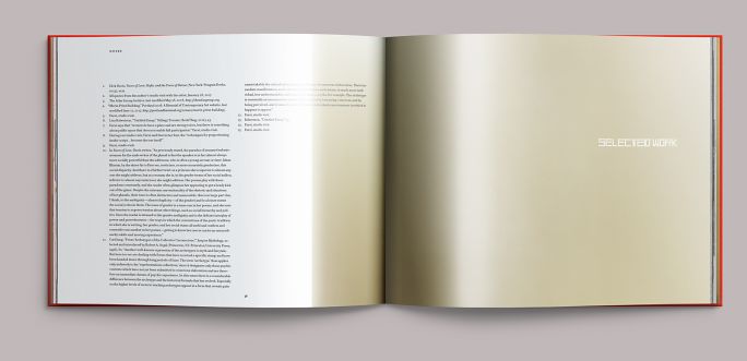 That sense of movement should be evident throughout the book. Here, the endnotes for Dalton’s essay overlap a large field of metallic gold, signifying the transition into the book’s second half and creating a figure/ground relationship where the section divider appears to be sliding left.