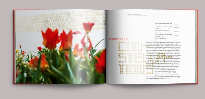 The book’s principal colors are red and gold: red from the tulips of Farsi’s Units of Moveable Earth and gold from The Names, though both colors show up regularly in her other work as well.