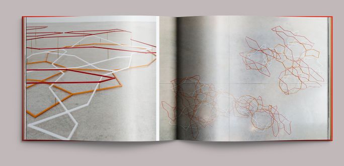 The Points of Departure presents in landscape format, for reasons both practical and thematic. Most of the documentation is horizontal, but the work itself reads as interior landscapes, which can’t be contained in a single image. The pages of the book must walk the reader around the work over several images. A panoramic format suits this approach. The finish size of the book as shown is 11 × 9 inches, giving an overall proportion of approximately 1:1.2, or a half octagon.