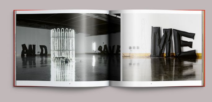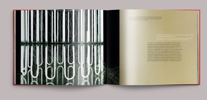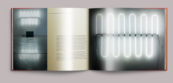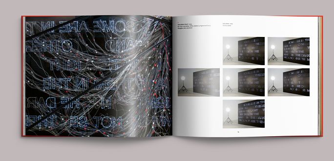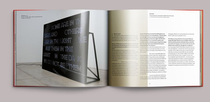 The artist’s conversation with curator Kristan Kennedy is concerned mainly with the work shown, the programmed LED panel And others (2015), but is different from other types of information in the book. Accordingly, it is set in three columns, only partially overlapping the gold field.